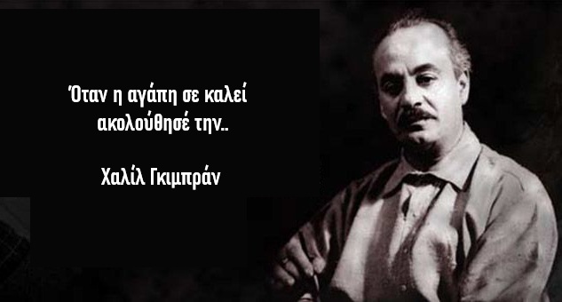 Όταν η αγάπη σε καλεί, ακολούθησέ την, μ’ όλο που τα μονοπάτια της είναι τραχιά και απότομα. Κι όταν τα φτερά της σε αγκαλιάσουν, παραδώσου, μόλο που το σπαθί που είναι κρυμμένο ανάμεσα στις φτερούγες της μπορεί να σε πληγώσει. Κι όταν σου μιλήσει, πίστεψέ την, μόλο που η φωνή της μπορεί να διασκορπίσει τα όνειρα σου σαν το βοριά, που ερημώνει τον κήπο.